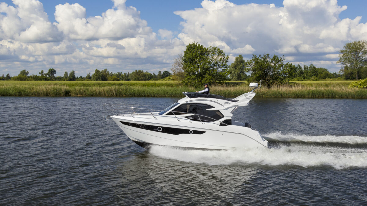 コンパクトなフライブリッジを備え、安定したクルージングを楽しめる一艇。