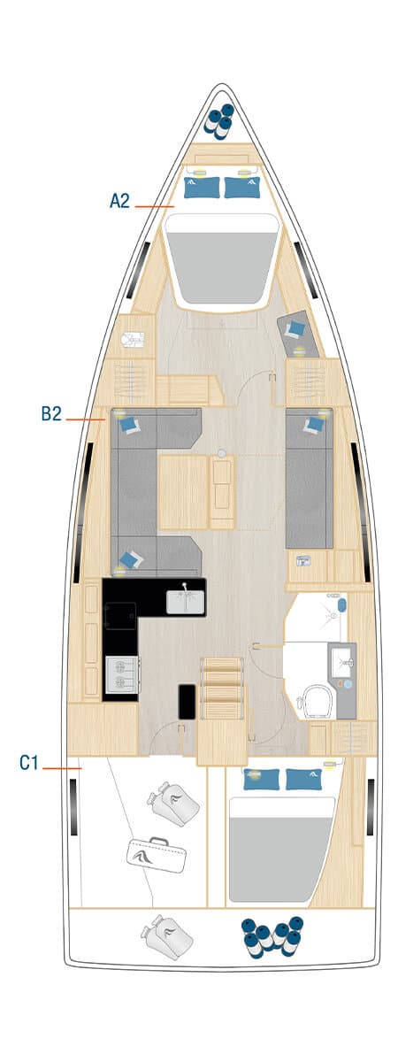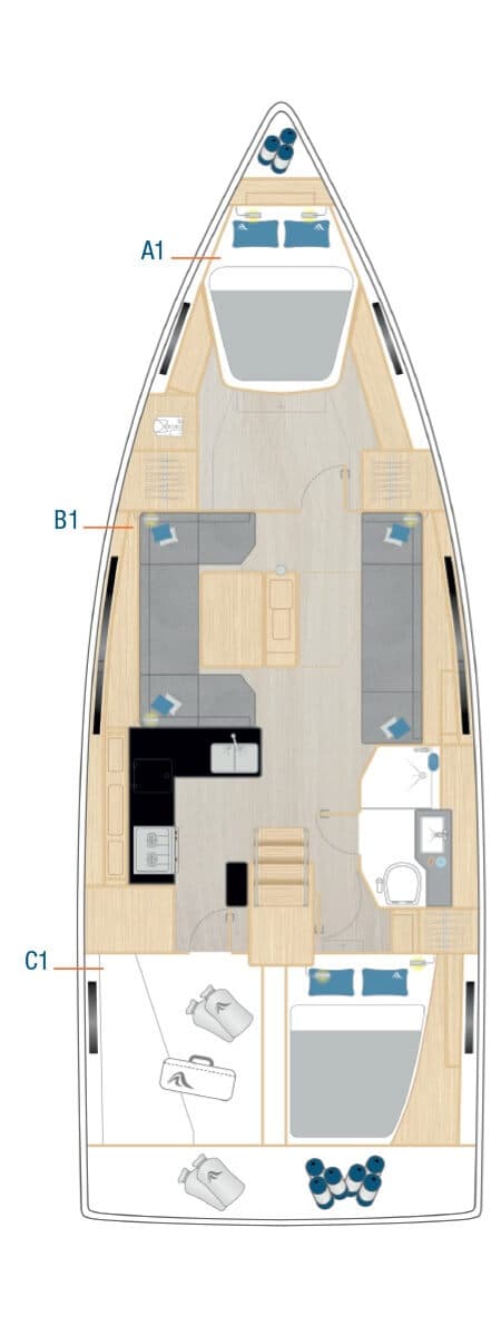 未来へ一歩踏み出してください。海での洗練された雰囲気を再び再現し、船首や船尾に顎を特徴とする最適化された船体は、ハンゼにとって妥協を許さない性能と、典型的なセーリングの容易さを実現しています。電動推進やその他の持続可能性機能により、彼女の環境への影響を最小限に抑えることができます。最大3つの広々としたキャビンと、ガレーや彼女の広いコックピットのような快適なサロンが、デュアルテーブル付きの広々としたスペースを備えています。