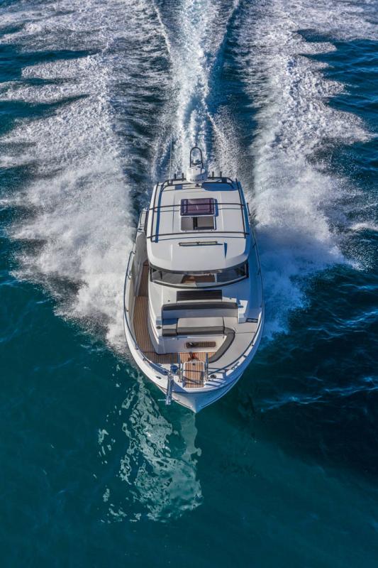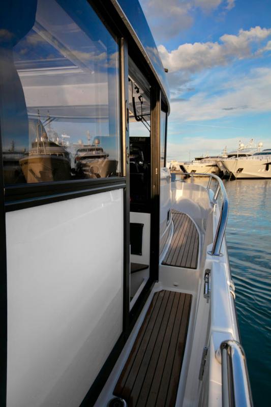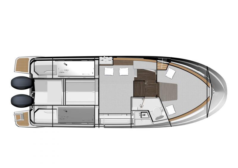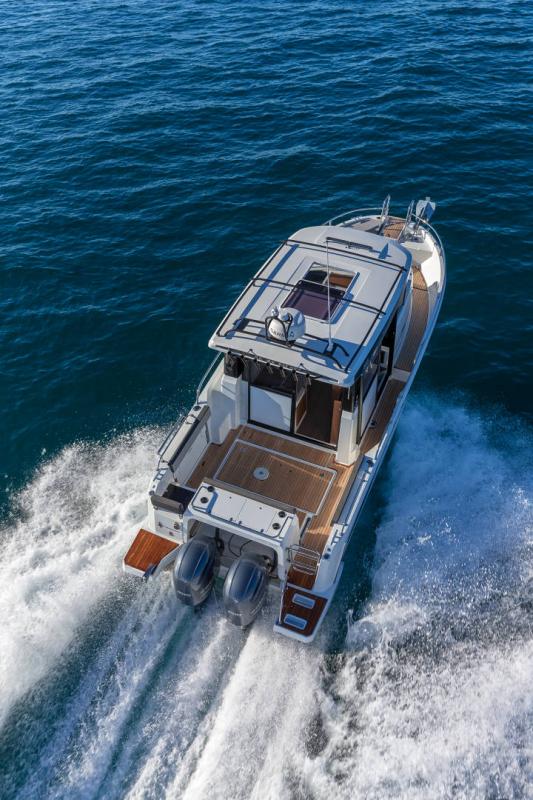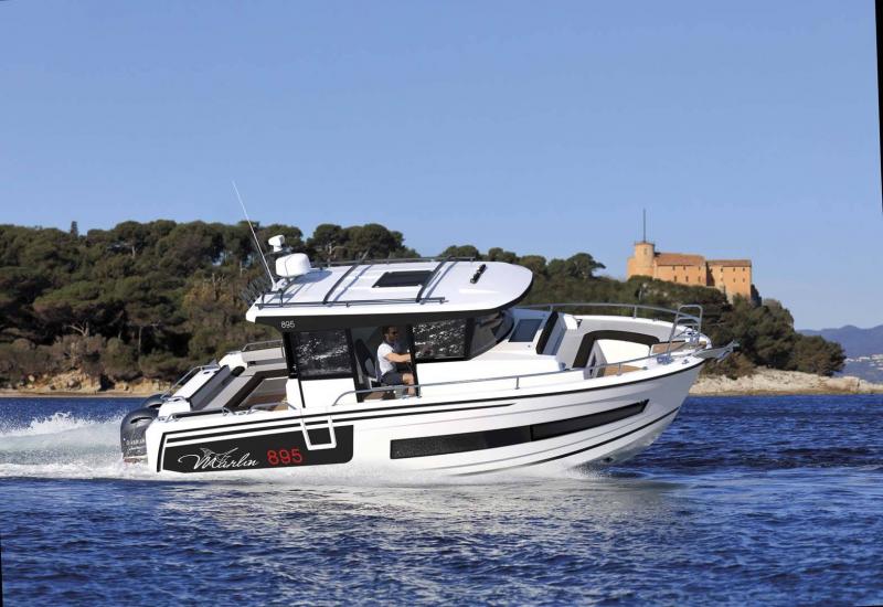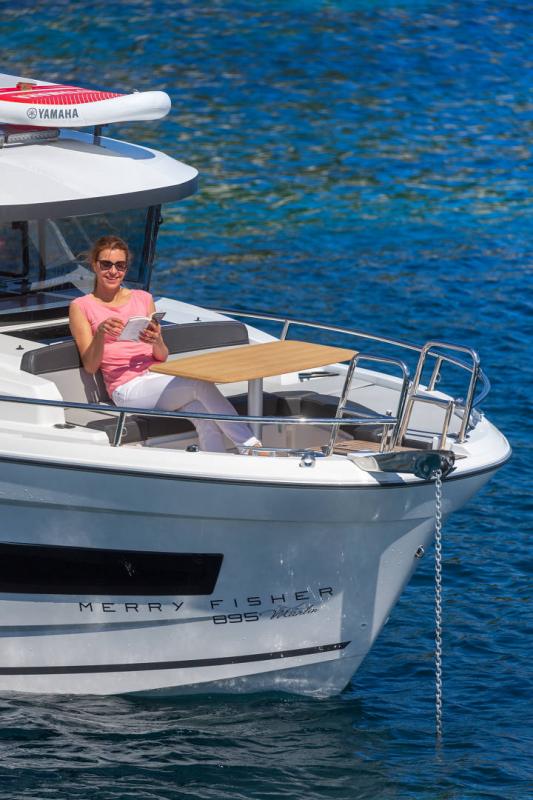 メリーフィッシャー895マーリンは、 そのスポーティなシルエットは美しく、 全く新しいコンセプトのアシンメトリーなレイアウト 実用的で快適なインテリア等、多くの点で 革新的なボートと言えます。 ヘルムステーションのサイドドア、後部のドアはともに 広く開放され導線が良く、また余裕の天井高も実現 フォアデッキとアフトデッキの移動を右舷に限定することで キャビンスペースの居住性は驚異的に高くなりました。 後方のスイミングプラットフォームには格納式ラダーを装備 船外機を上げる際には、後方ベンチシート部分が スライド移動し上架時の船外機のスペースを確保します。 ホンダのBF船外機250馬力(こだわりのグランプリホワイト) 2基掛け、40ノットを超える最高速をマークしました。