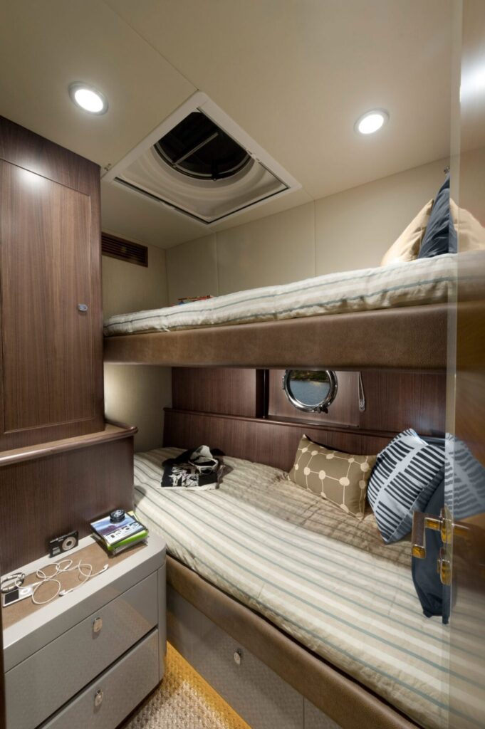 このスタイルとサイズのモーターヨットではめったに見られない、マスターステートルームがヨットのフルビームを延長している。主人と同じくらいの豪華さを誇るVIPの客室は、クイーンサイズのアイランドベッドを備えた前方Vセクション全体を占めています。3つ目のゲスト用客室は、大人用サイズのシングルベッド2台で、特に高い位置が設けられています。宿泊施設のデッキには2つのバスルームがあります。