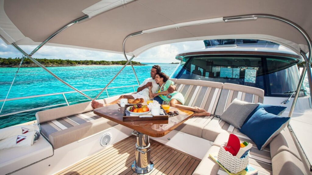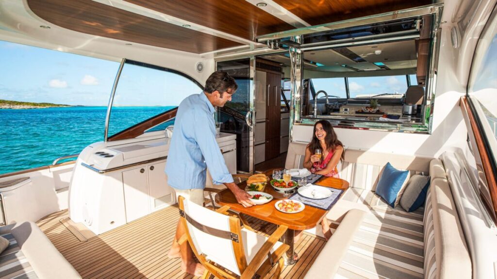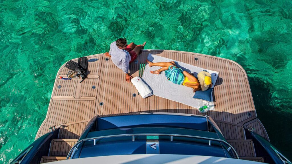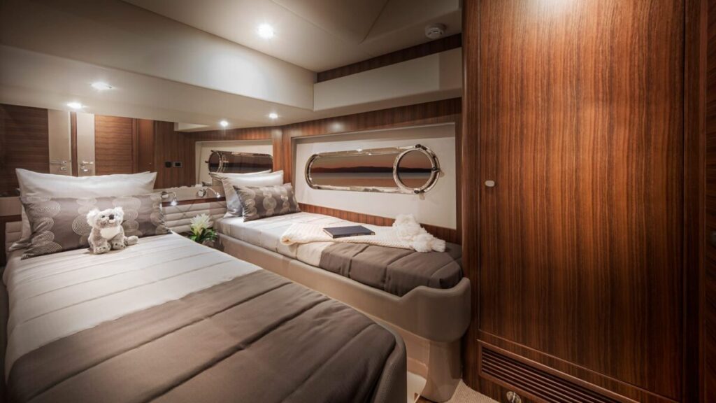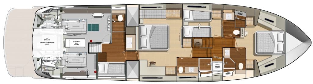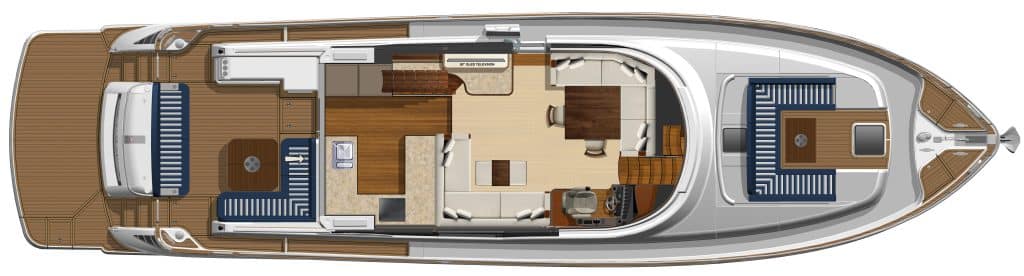トランサムゲートで、柔らかいガレージが付いた大きなチーク編みのコックピットに入り、その下や横の防波堤のドアを通って入る。豊富なサルーンエリア全体を、厳選された生地とオーダーメイドの仕上げでカスタマイズできます。U字型のギャレー、フォワードのダイニングエリア、自立型のラウンジは、すべて楽しめるでしょう。外には、広いハイサイドデッキがサンラバーのフォアデッキへとつながっています。