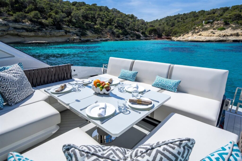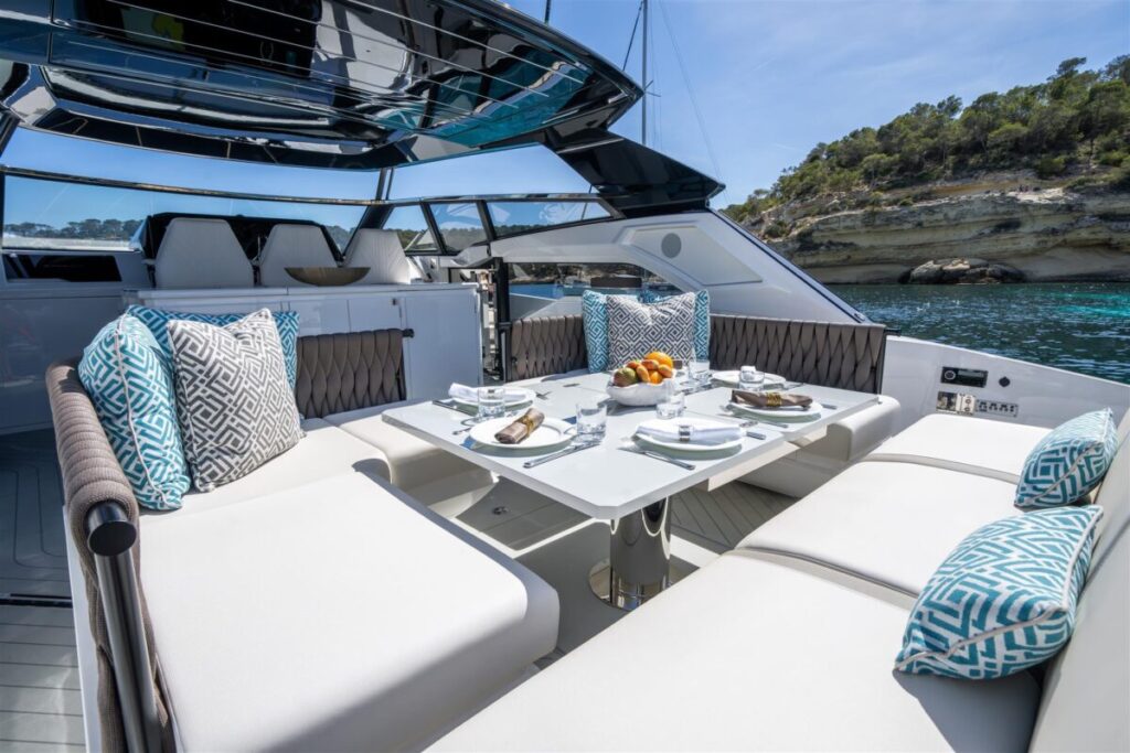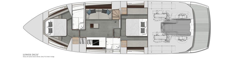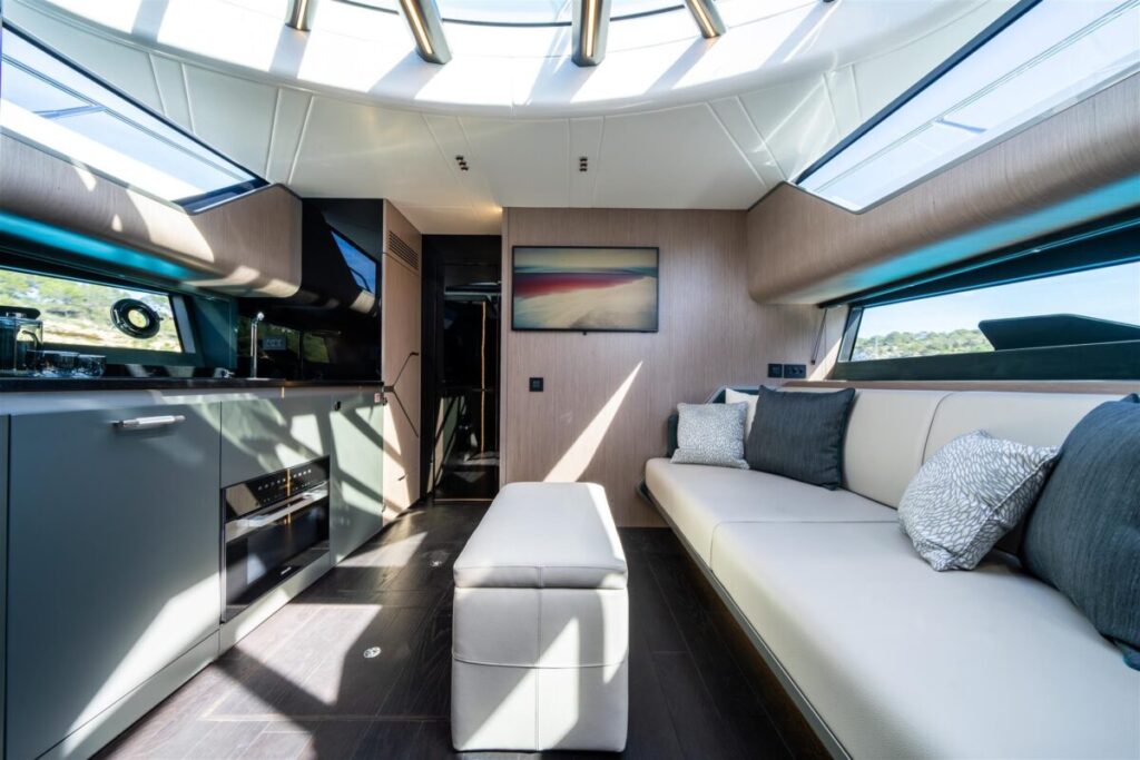 スーパーホーク 55 は、ボルボ ペンタ IPS 950 ツイン エンジンのおかげで最大 38 ノットの最高速度に達し、アイコニックなサンシーカー スポーツ クルーザーを再発明しました。現代的なプロポーション、豪華な屋外スペース、広々とした室内設備を備えたスーパーホーク 55 は、日中のクルージングや週末の外出に適しており、比類のないユーザーの柔軟性を提供します。人目を引くエクステリアは、同様に光沢のあるインテリアの装備と機能を調和しています。後部コックピットは、中央の大きなウェットバーといくつかのインテリアオプションで設計されており、広々としたデッキを最大限に活用できます。 階段を降りると、非常に豪華なオープン プランのロビーと、LED照明の下にあるギャレーエリアがあります。