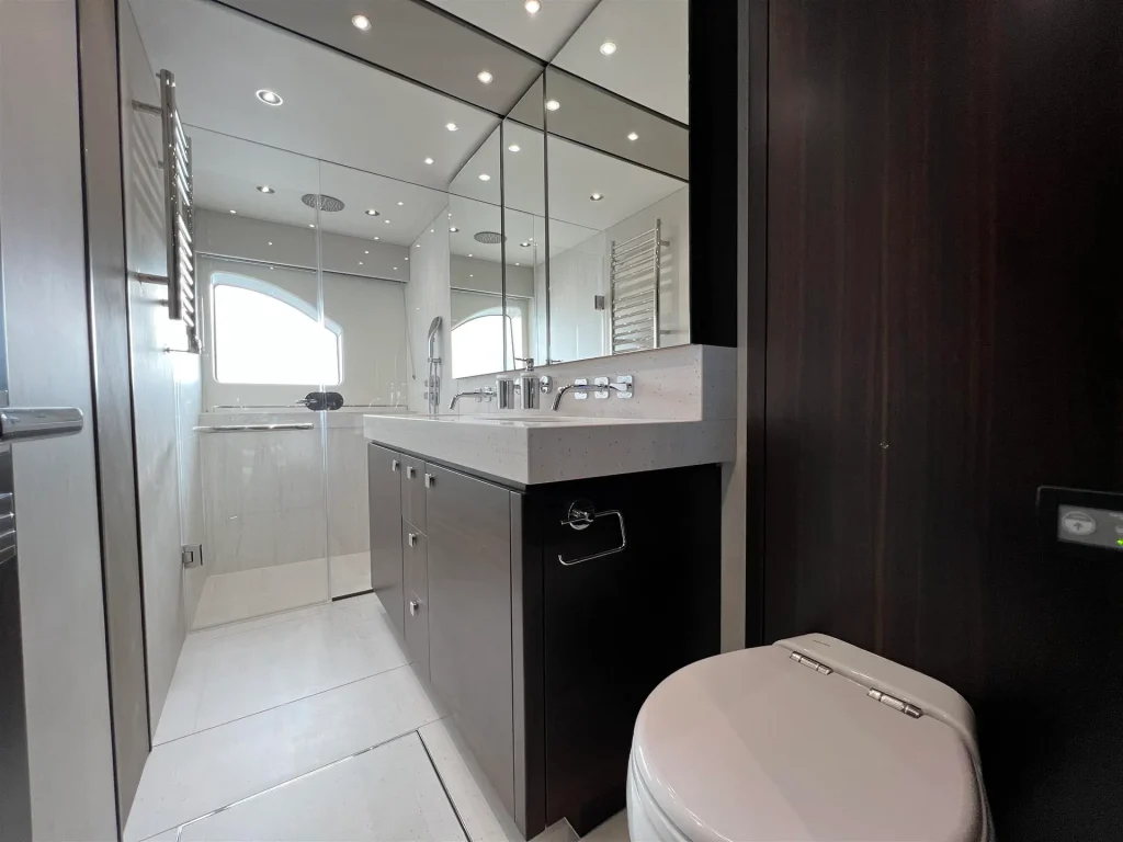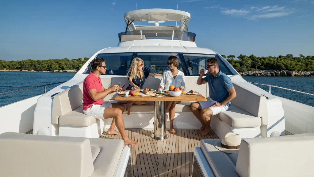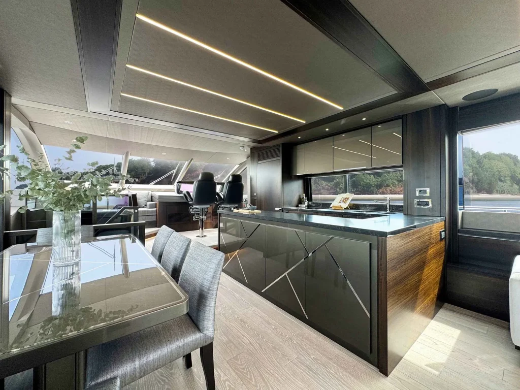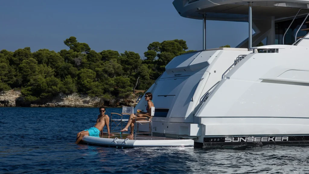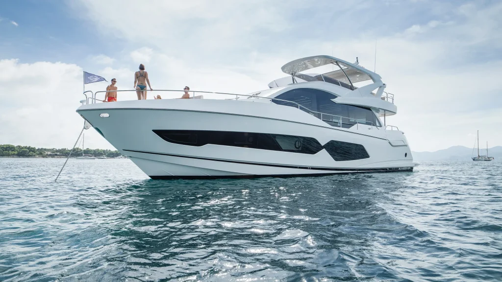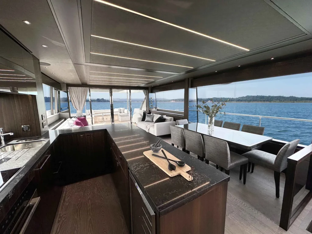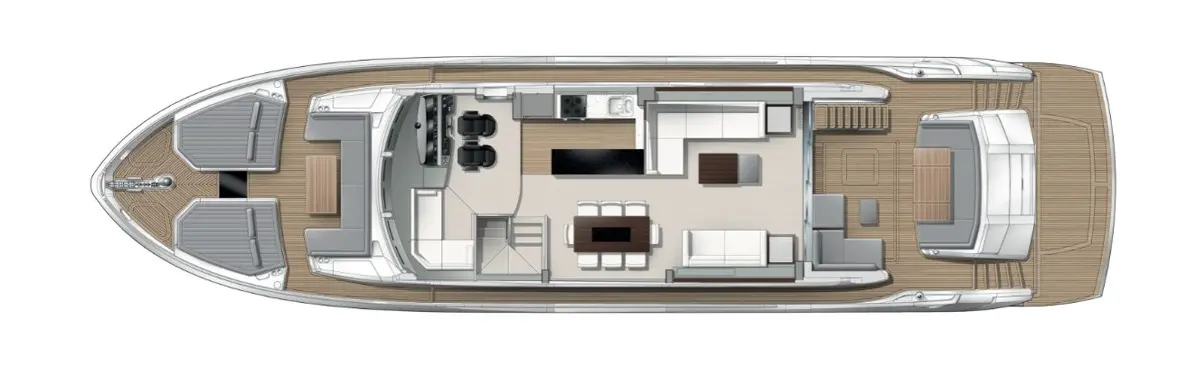 76ヨットはサンシーカーの魅力をすべて詰め込んだ極上の一艇です。 パフォーマンスやボディなど、船首から船尾までかけてわかるのはやはりその美しさ。近年のディープVハルから繰り出される耐航性は70ftクラスを代表する走りとなります。 このモデルの印証深さは水平線に浮かぶシルエットに限らず、大きな窓から差し込む光がサロンへと誘い、サロンから見える360°の景色にもあります。 デッキには遊び心が見え隠れ。フライブリッジのアフトスペースにはジャグジーを設置できる個所があり、そちらはまたジェットスキーや大きなサンベッドにもなります。もちろんカクテルバーを配置することも可能で、スーパーヨットのようにレイアウトを選択する楽しみがあります。 アフトコックピットとサロンの境界線にはラウンジソファーを置くこと、またはカクテルバーを設置することが可能です。 プラットフォームにはビーチクラブパッケージをオプションで追加することができ、バーベキューグリル、折りたたみシート、シャワーがついてくることで家族や友人との遊び方が広がります。 さらにはリフティングプラットフォームを延長することで、ウィリアムズジェット445を搭載できます。 特徴的なレイアウトはフォアデッキにも施されています。大きなサンベッドをバウデッキの左右に配置することにより、仲間で盛り上がることができます。 新しい76ヨットの自由度に限りはありません。